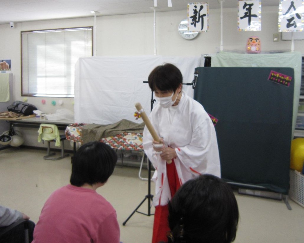新年会では、職員が宮司&巫女に変身して新年の挨拶や幸福を願う言葉を利用者さんに伝えました!