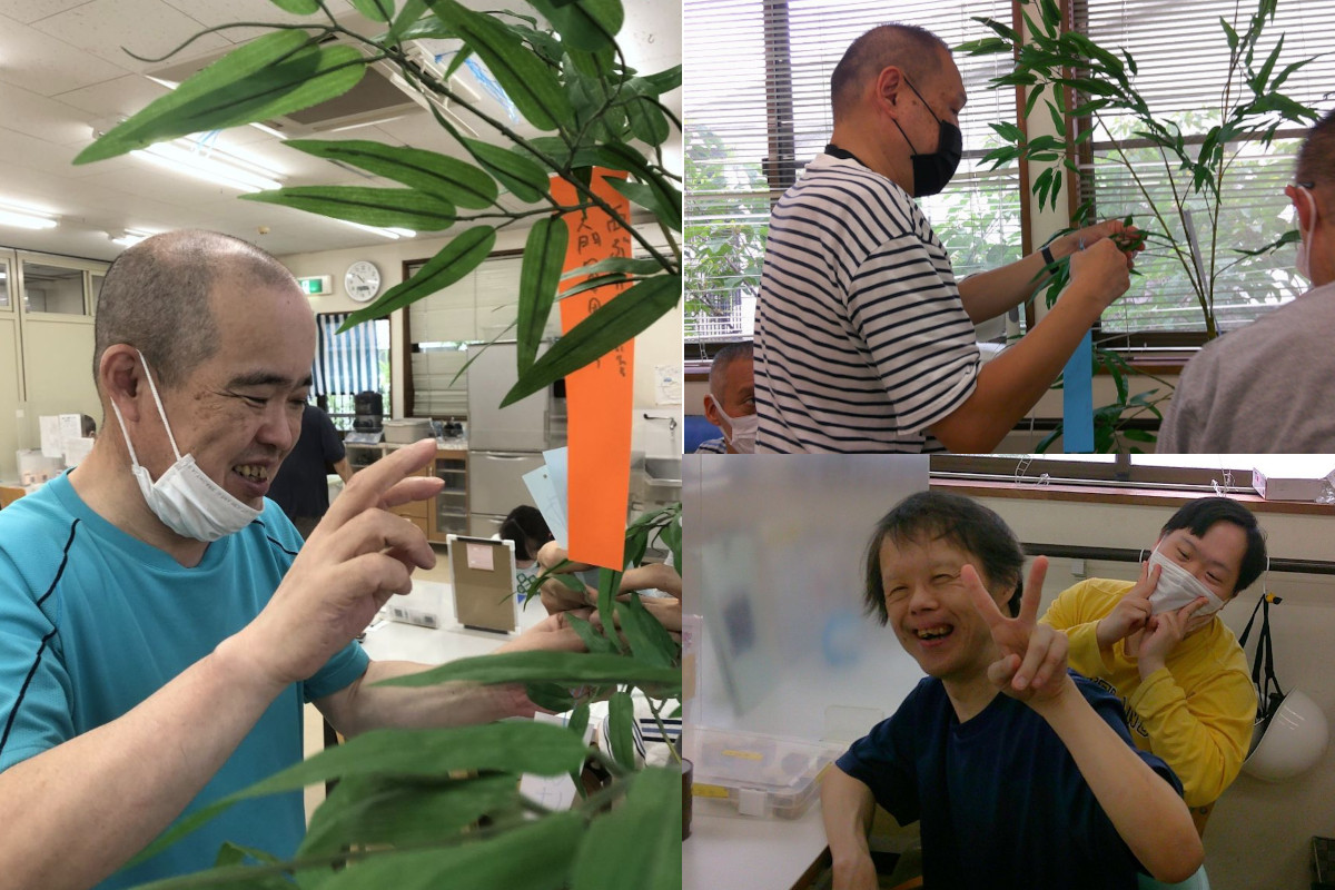 利用者さんに3つの願い事を短冊に書いていただき、厳選された1つを笹に飾る毎年恒例のイベントです。皆さん真剣な表情で短冊を書かれていました。